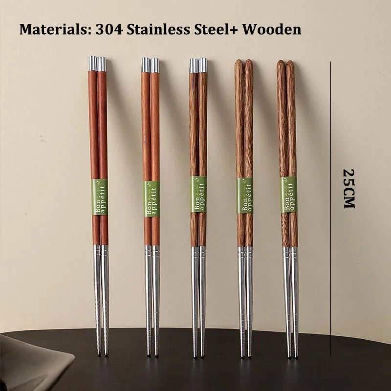 Design: A sleek spliced silhouette balances cool steel with warm wood for a striking modern aesthetic, inspired by traditional Asian craftsmanship with a contemporary twist — perfect for any table setting